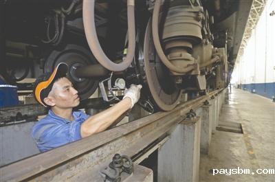 随后,李雪峰也钻进了列车底部,对已经检修的部件再次进行检查。1.73米的李雪峰只能弓着腰,小步穿梭在车底,额头上豆大的汗水也不断顺着脸颊流下。他告诉记者,这还不是车底最热的时候。“有时候列车刚刚回来就要进行紧急检查,车底的电阻制动箱、牵引电机都非常烫,表面温度高达80℃。车下作业的检修人员不仅要忍受高温,还必须非常谨慎,绝对不能触碰到这些部件。”